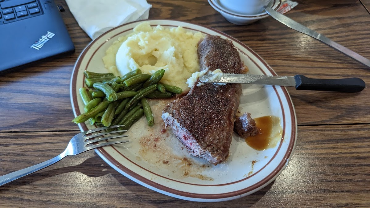 I stopped very early for lunch - 11:30 a.m. - after having two separate riders spill water in my car. Needs time to dry, dontcha know. And since it was early, it's breakfast for me. The service is great. Prompt, friendly, good-natured. When the locals know the server's names and the servers know people's drink orders, you've found a good spot. This is a good spot. Quiet, relaxing, laid-back. Counter seating, 2 & 4 seat booths, 4 seat low-tops, as well. The food is good, too. I do wonder why restaurant toast is never hot enough to melt the butter, though. I ordered a Greek omelet with hash browns & whole wheat toast. A really good omelet and the hash browns were great, crunchy exterior, soft interior. Close to perfect.